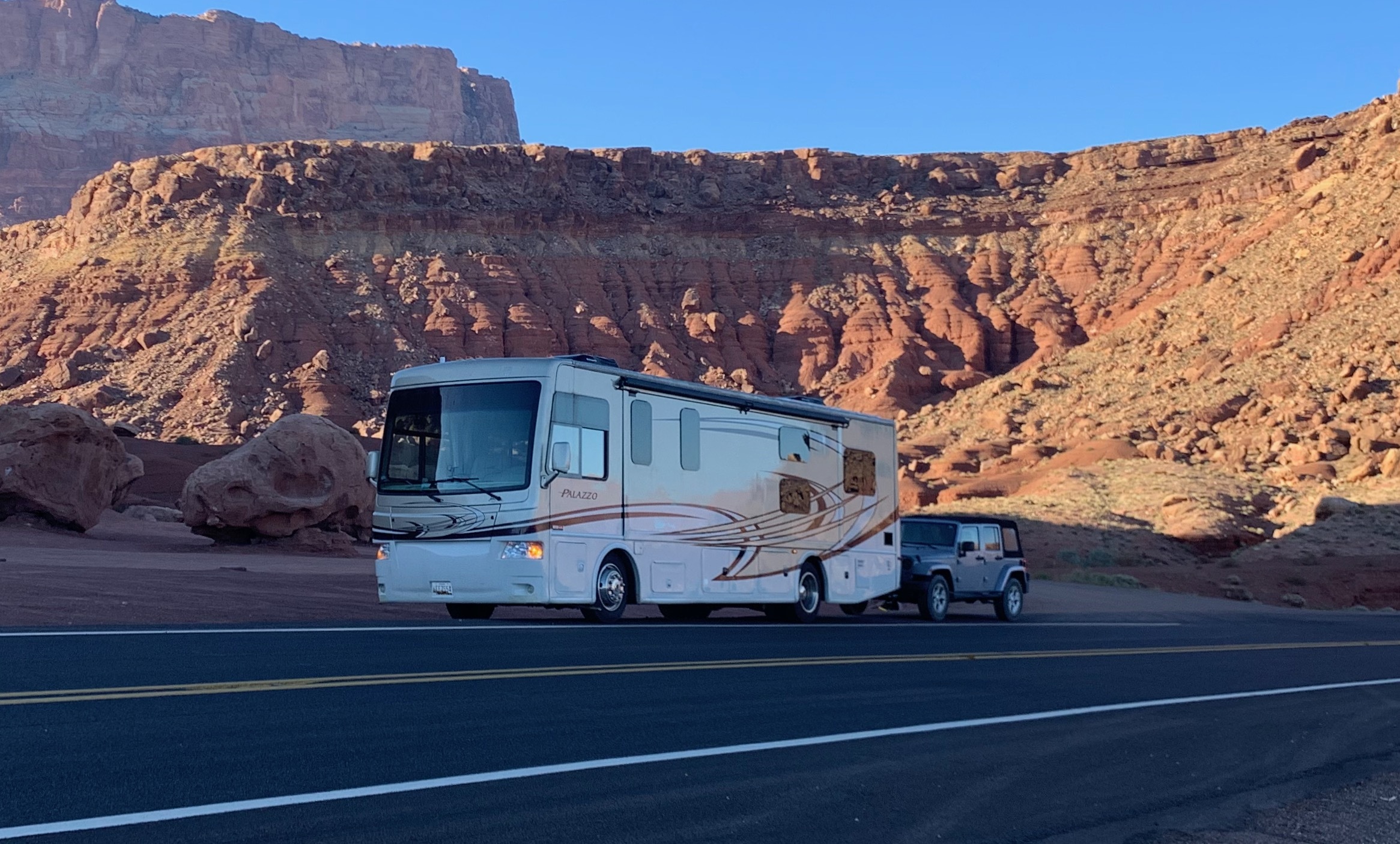With 2 slideouts and sleeping 7 the palazzo gets you there with ease and grace.